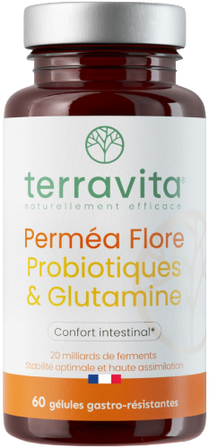 Permea Flore, riche en probiotiques et glutamine, qui prend soin de la flore intestinale et répare la barrière cutanée de l’intérieur.